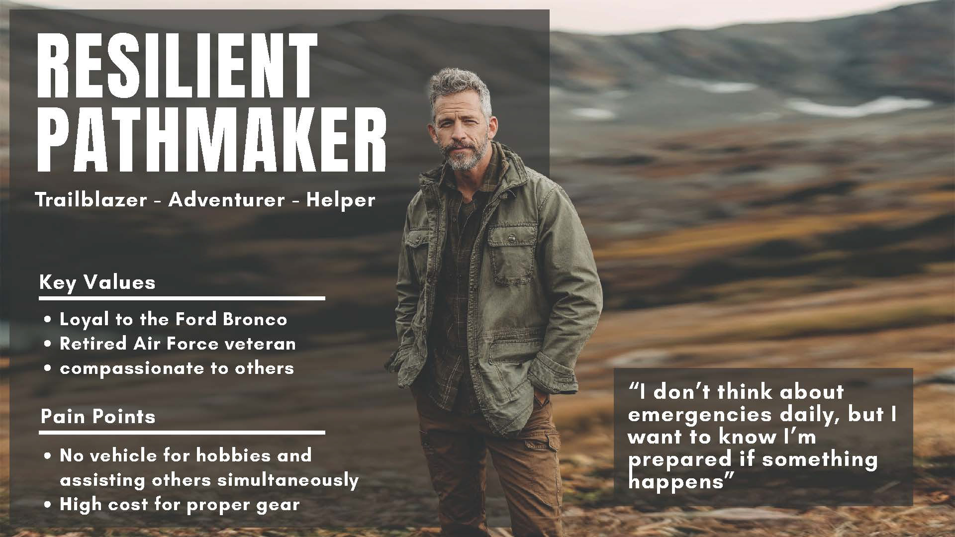 Design a disaster response kit for the Ford Bronco, while creating a new way for Ford to market and sell aftermarket parts to provide a “call to action” for all Ford Bronco owners.